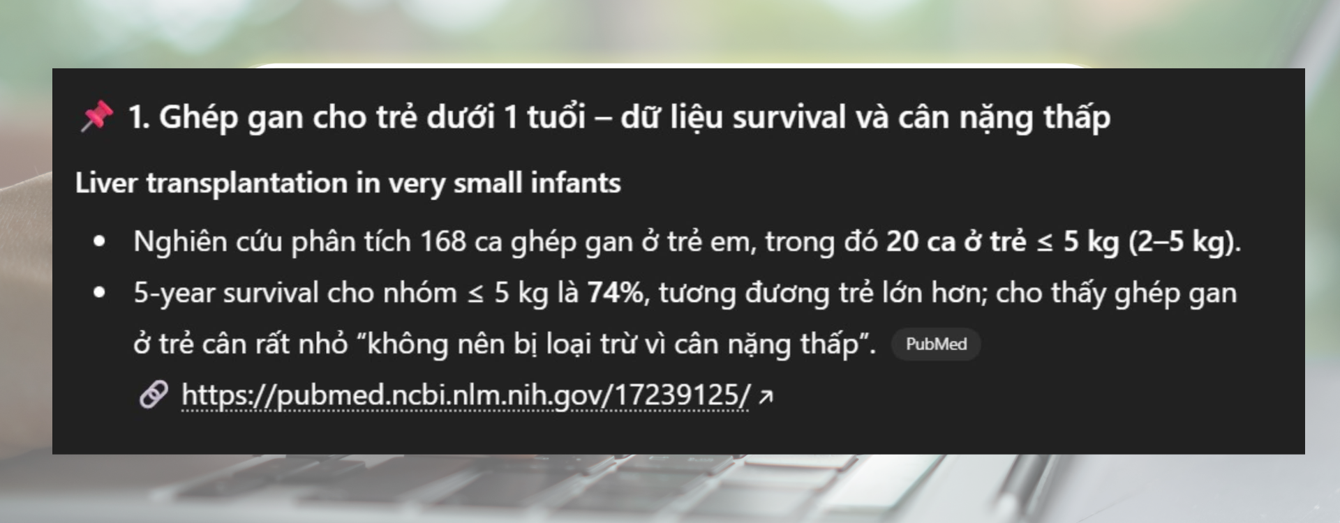 Ví dụ, Khi AI nhận được câu hỏi: “Tôi đang làm truyền thông cho một dự án y tế và muốn tìm hiểu về các ca ghép gan ở trẻ dưới 1 tuổi, cũng như những rủi ro và bệnh lý nền có thể liên quan”. Dưới đây là kết quả nhận được:
